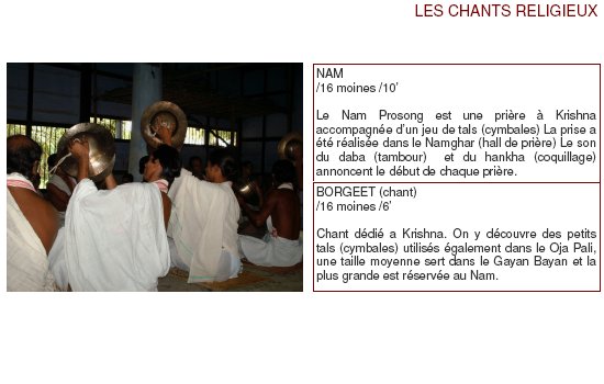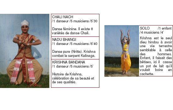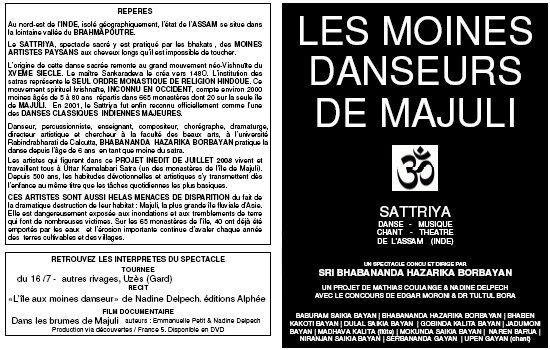 Les artistes présentés vivent et travaillent tous à Uttar Kamalabari Satra ( un des monastères de l’île de Majuli). Ils interprètent des œuvres qui s’illustrent dans toutes les cérémonies religieuses ou de cour dans l’état enclavé de l’Assam. Leur virtuosité, alliant simplicité et noblesse, atteint un niveau d’excellence, entre pureté et technique, dans l’interprétation des pièces du Sattriya.