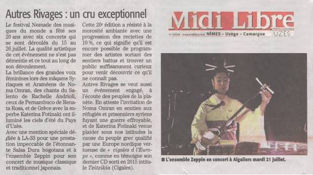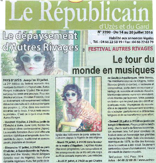 La vingt-et-unième édition du festival nomade des musiques du monde en pays d'Uzès, Autres Rivages a lieu du 12 au 23 juillet. Donia Massoud (Egypte), Burei Uchi (Japon), Kuku (soul, Nigéria), Lagrimas Azules (flamenco progressif), Vakia Stavrou (Chypre), Pouya (chant soufi de femmes, Iran). Yves Defago reçoit Christian Florentin, directeur artistique du festival
