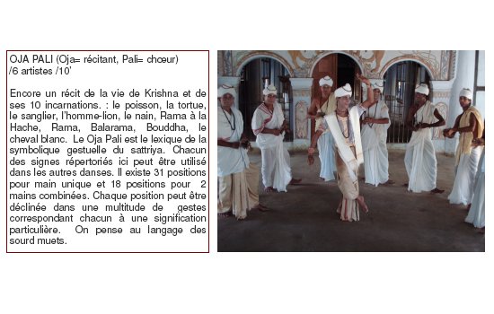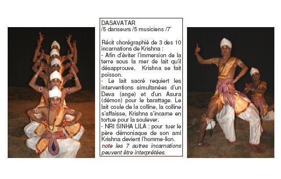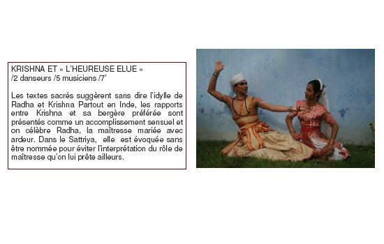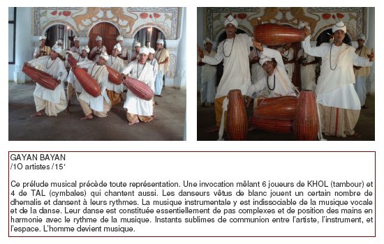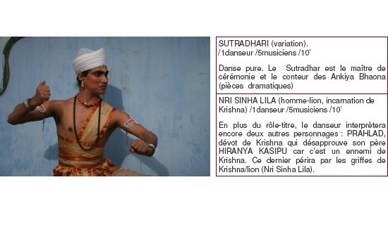 Les artistes présentés vivent et travaillent tous à Uttar Kamalabari Satra ( un des monastères de l’île de Majuli). Ils interprètent des œuvres qui s’illustrent dans toutes les cérémonies religieuses ou de cour dans l’état enclavé de l’Assam. Leur virtuosité, alliant simplicité et noblesse, atteint un niveau d’excellence, entre pureté et technique, dans l’interprétation des pièces du Sattriya.
