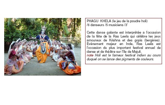 L’Assam, région du Nord de l’Inde dans la lointaine vallée du Brahmapoutre, longtemps restée fermée au reste du monde a vu naître et se développer le Sattriya, spectacle sacré et didactique interprété par les Bhakats, moines-artistes-paysans, qu’il est impossible de toucher ni directement ni par l’intermédiaire d’un objet.
