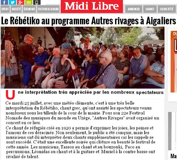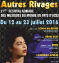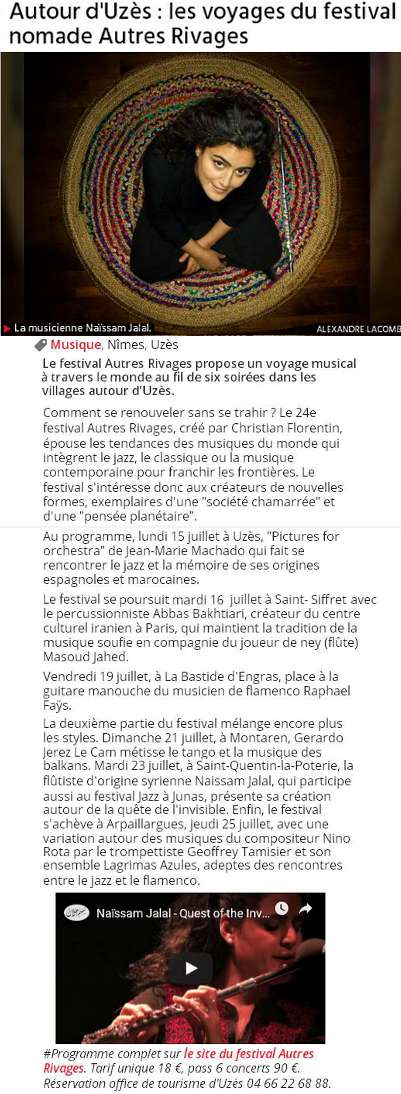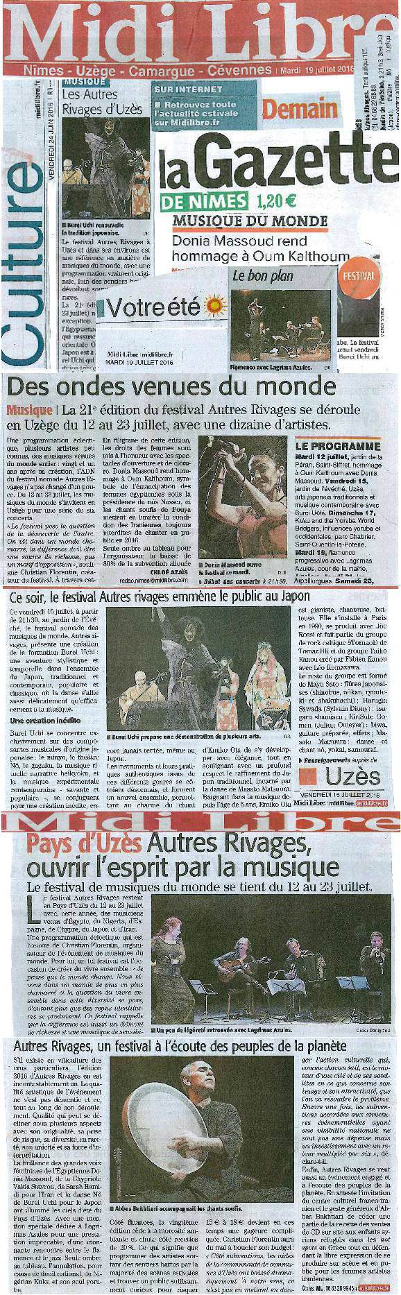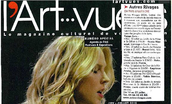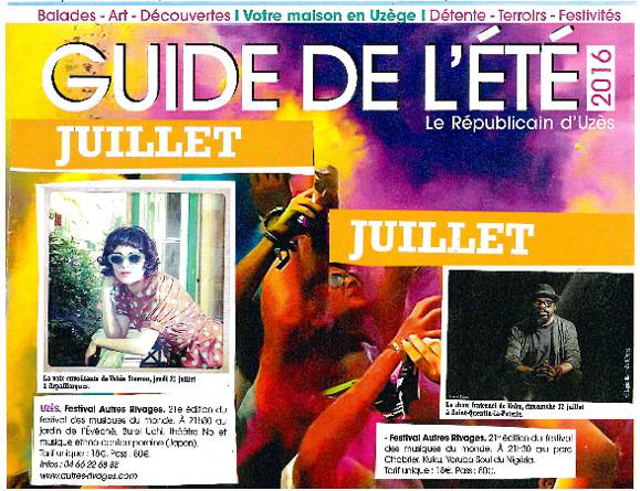 La vingt-et-unième édition du festival nomade des musiques du monde en pays d'Uzès, Autres Rivages a lieu du 12 au 23 juillet. Donia Massoud (Egypte), Burei Uchi (Japon), Kuku (soul, Nigéria), Lagrimas Azules (flamenco progressif), Vakia Stavrou (Chypre), Pouya (chant soufi de femmes, Iran). Yves Defago reçoit Christian Florentin, directeur artistique du festival